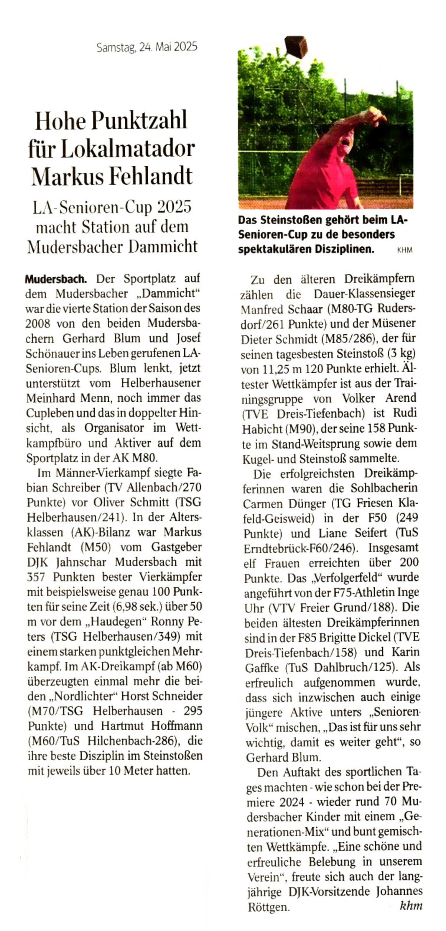 Unsere Ältesten und unsere Jüngsten stellten beim diesjährigen Sportfest auf dem Dammicht in Mudersbach die meisten Teilnehmer in ihren Altersklassen. Bei den 6-7jährigen waren 19 Teilnehmer am Start und die über 80-jährigen lagen mit 17 Teilnehmer nur knapp darunter. Zum 2. mal stand das Sportfest unter dem Motto GenerationenMIX, um durch gemeinsame sportliche Aktivitäten auch den Nachwuchs für Sport und Wettkampf zu begeistern. "Es hat funktioniert" war die einhellige Meinung aller Teilnhmer und Besucher. Bericht Siegener Zeitung 29. Karl Birkelbach Gedächtnistreffen am 3.Mai 2025 in Littfeld