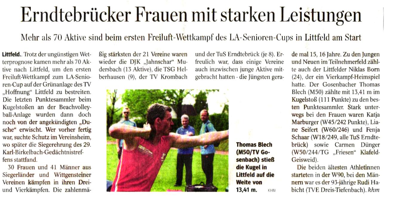 "Wir sind sehr zufrieden mit euren Leistungen und Ergebnissen" damit eröffnete Manfred Funk die diesjährige Siegerehrung. 71 Wettkämpfer (im Vorjahr 72) nutzten die Gelegenheit bei der Freilufteröffnung in Littfeld, um ihre Leistungen mit anderen Wettkämpfern der gleichen Altersklasse zu vergleichen. Vermutlich war so manch ein Unterlegener nicht mit seinen eigenen Leistungen zufrieden, um so mehr freut es natürlich, dass der Veranstalter zufrieden ist. Die angekündigte Schlechtwetterfront erreichte Littfeld Gottseidank erst nach Abschluss der Wettkämpfe, die in diesem Jahr schnell und zügig abgewickelt wurden. Die Siegesfeier fand in gewohnter Umgebung mit einem perfekten Kuchenbuffet und einem reichhaltigen Angebot an Getränken statt. Der TV Littfeld war ein perfekter Gastgeber. Bericht Siegener Zeitung